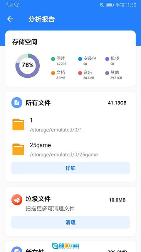 4、下方展示的是手机内存使用情况,用户可在此进行扫描与清理操作。扫描完成后,系统会生成一份详细的分析报告,帮助用户更清晰地了解并管理设备状态。用户还能自主选择不需要的数据进行清理,从而让设备运行更轻松流畅。