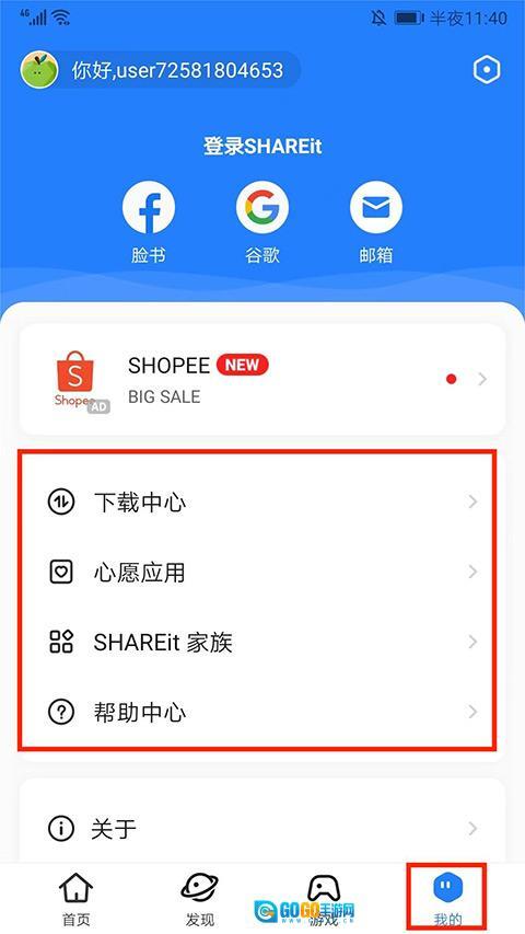 7、在“我的”界面中,设有中心、心愿应用、SHAREit家族以及帮助中心等功能选项,用户能够依据自身需求进行选择使用,比如查看文件或获取帮助支持。以上内容便是茄子快传的具体使用方法。