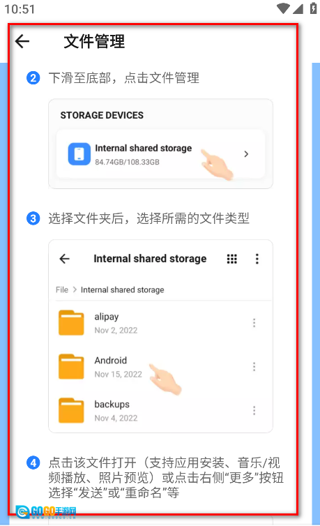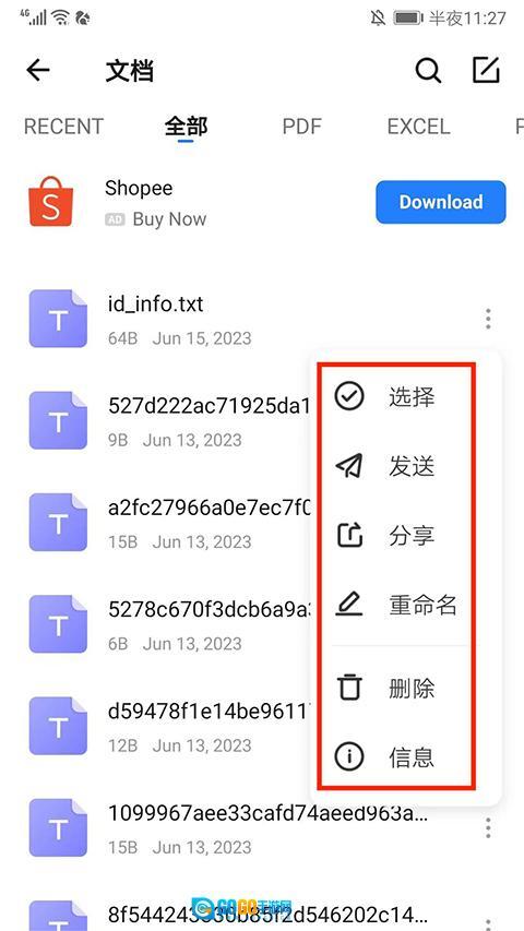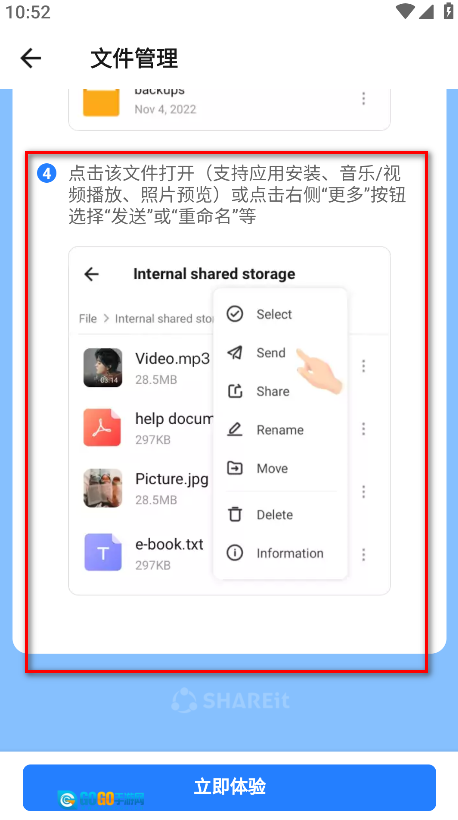 3.点击该文件即可打开(支持应用安装、音乐/视频播放、照片预览);也可点击右侧的“更多”按钮,选择“发送”“重命名”等操作。