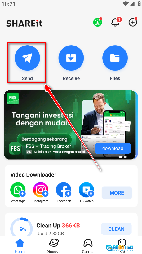 1.发送方需打开茄子快传应用,点击界面上的“send”按钮,该按钮对应的功能即为发送。