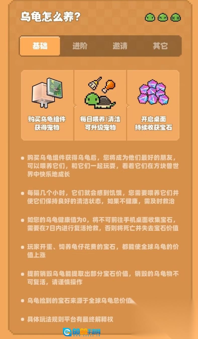 可获得电子乌龟(它会显示在你的手机桌面上),通过它你能持续获取宝石收益。②每隔一段时间要给乌龟喂食和清洁,要是它的健康值降到0了,得在7天内进行复活抢救。