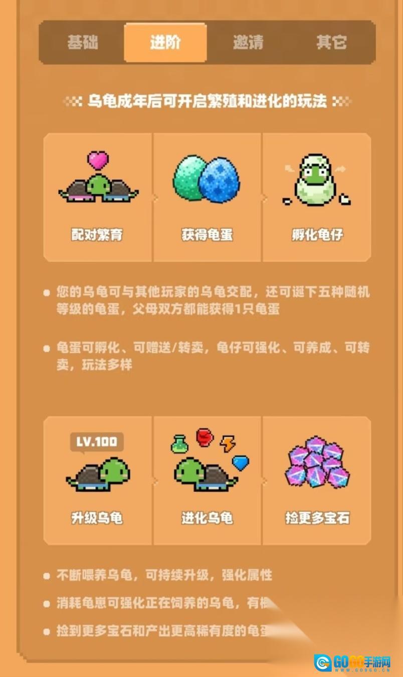 配对繁衍,获取五种随机龟蛋;龟蛋支持孵化、赠送或转卖,龟仔则能进行强化、养成或转卖;相关操作手续费为3%;②消耗龟崽可强化乌龟;类似装备合成;
