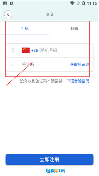 3、若选择手机注册,需填写【手机号码】,点击【获取验证码】并填入验证码后,点击【立即注册】即可完成手机渠道的账号注册。