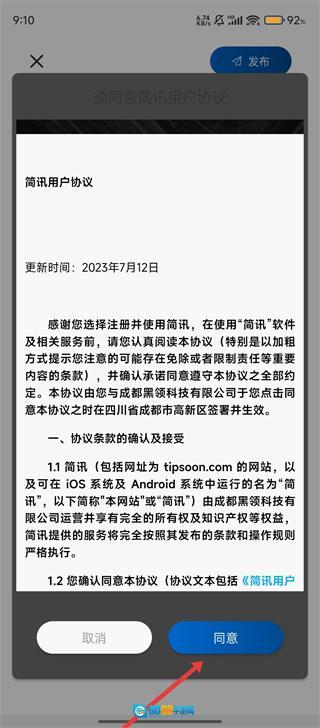 3、发布前请仔细阅读【简讯用户协议】,确认内容无误后点击【同意】按钮,方可进行后续操作。