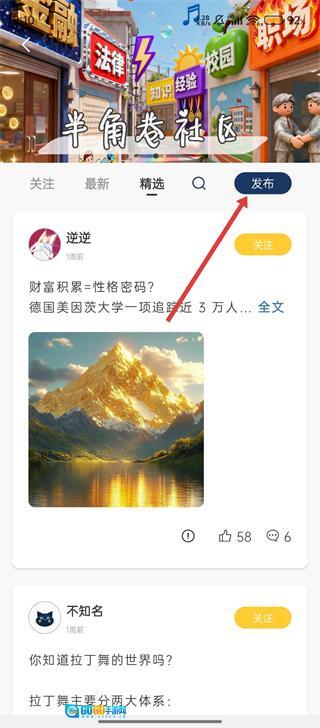 2、进入【半角巷社区】界面后,找到右上角的【发布】按钮,点击该按钮即可启动发布流程。