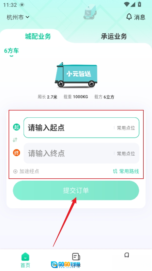 1、进入软件登录,输入起点和终点提交订单