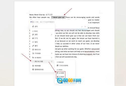 文字、PDF、演示、表格以及智能文档——选定需要处理的词汇或句子——找到WPS AI选项——选择AI解释或AI翻译功能。