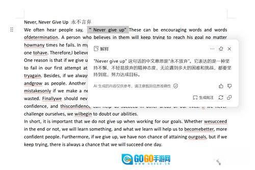 3、要是遇到需要强化记忆的内容,你可以一键生成批注并保存,这样下次查看时就能快速抓住重点;当然,也能直接选中内容让WPS AI帮忙翻译。