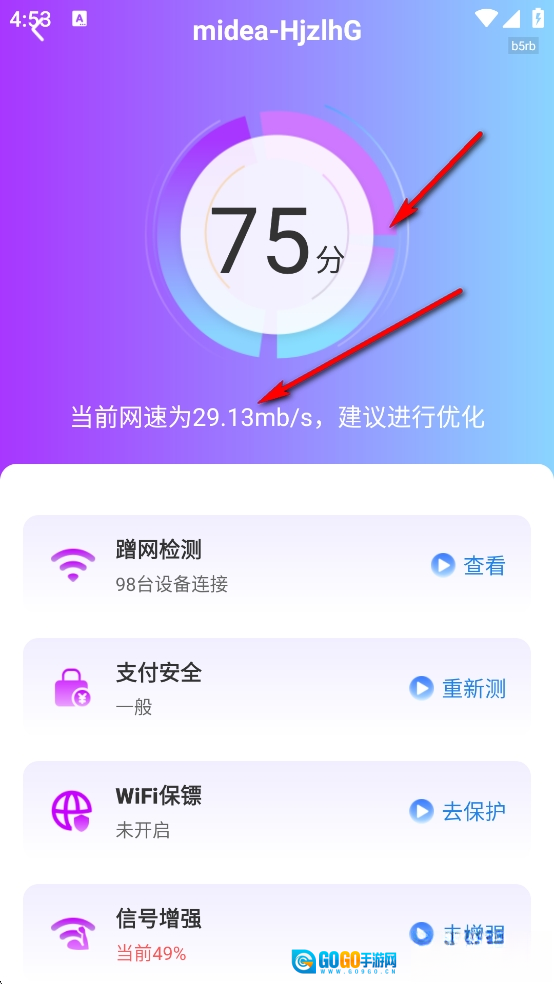 可以查看检测分数和当前网速