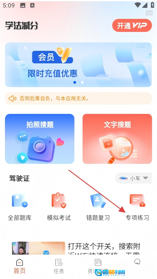 1、进入【学法减分】首页,点击【专项练习】选项,进入小车专项练习页面。
