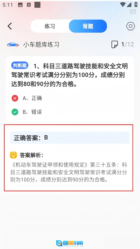 4、在背题模式下,可查看题目正确答案及解析,借助解析辅助记忆驾考知识点。