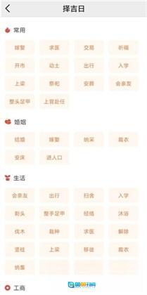 在首页功能栏中选择“择吉日”选项,就能依据个人的计划安排以及具体用途(比如搬家、开业、出行等)来进行择日的相关设置。