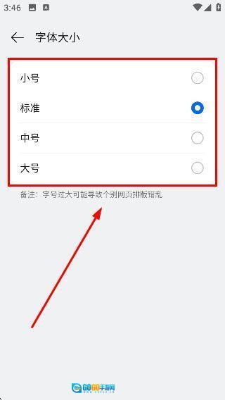 4、进入字体大小设置页面后,可选择【小号】【标准】【中号】【大号】等不同的字体大小选项,以此完成字体大小的设置操作。