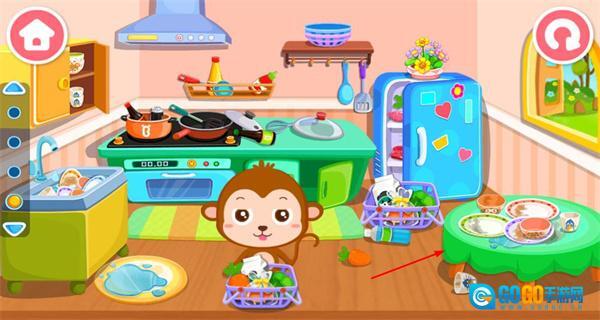 在厨房清洁的场景里,当看到杂乱的厨房布局和猴子角色时,点击需要整理的餐桌区域,就能进入餐具收拾的环节。