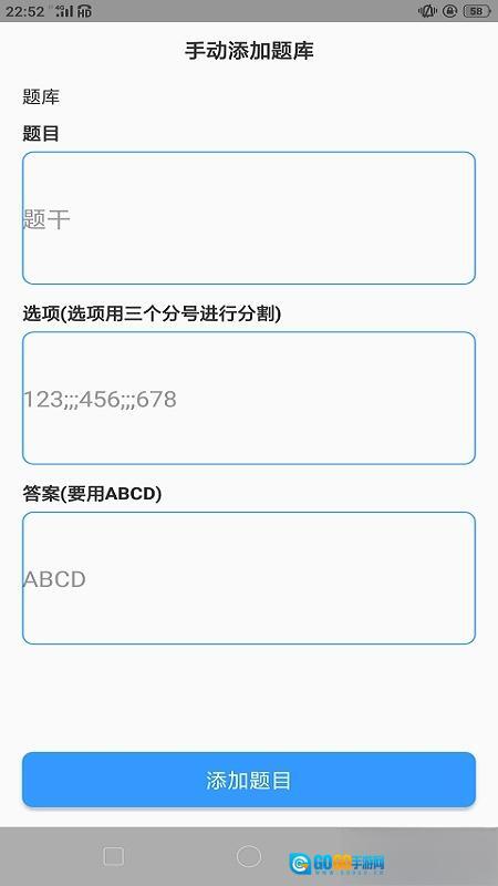 在线手动创作:除了通过导入文档来生成题库,该功能还支持用户直接在软件界面上手动制作题库。用户能够便捷地输入题目内容、选项设置以及答案等相关信息,整个操作流程简单易懂,即便用户手头没有现成的文档资料,也可以轻松打造出符合自身需求的个性化题库。