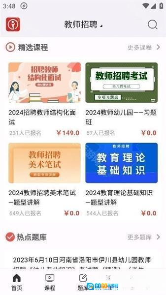 3、接着你就能获取到对应的精选课程、热点题库以及精选资料的推荐;