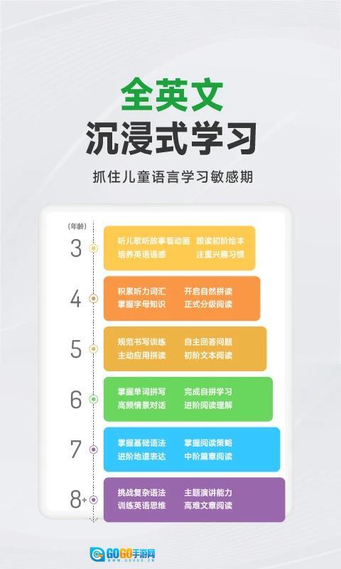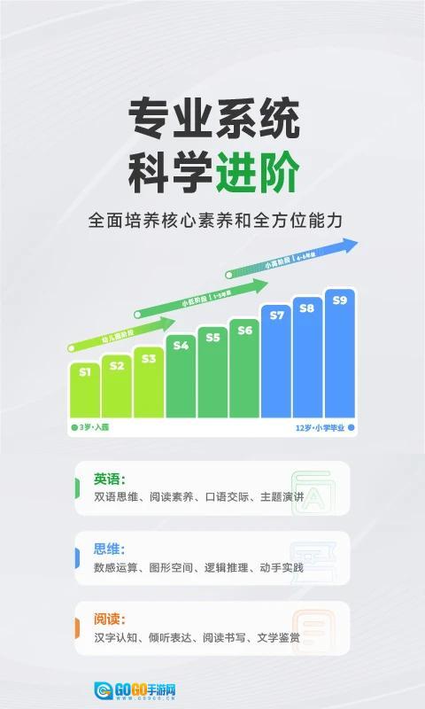 2.科学分阶体系:依托13年儿童成长研究成果,该软件把3到12岁的儿童划分为8个学习阶段,每个阶段都匹配了相应难度的内容。比如,在英语启蒙阶段,借助《Poor Joey》这类原创绘本,利用生活化的场景(像“切菜受伤”时的对话),助力孩子理解“What's the matter?”这类实用句型;而思维S1阶段,则通过“对应、比较、分类”等游戏形式,来培养孩子的空间想象能力和动手操作能力。