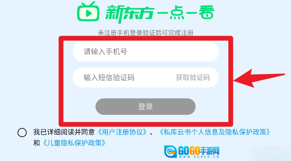 1、打开新东方一点一看后,输入手机号并获取验证码,完成登录或注册操作。
