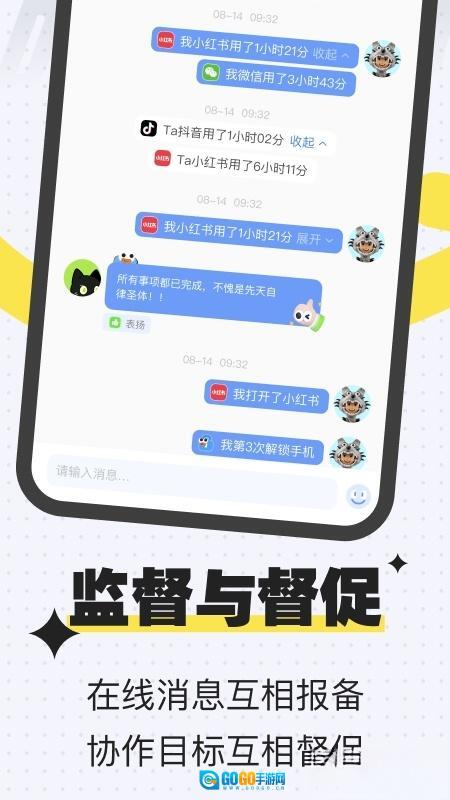 社交化监督体系:独创双人锁机功能,用户可与搭档远程锁定手机使用时长,通过强制断网机制根治手机依赖症,配合进度戳戳提醒功能形成闭环监督