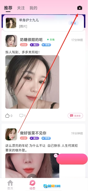 1.用户进入软件之后可以直接在动态页面中点击右上角的相机即可发布动态。
