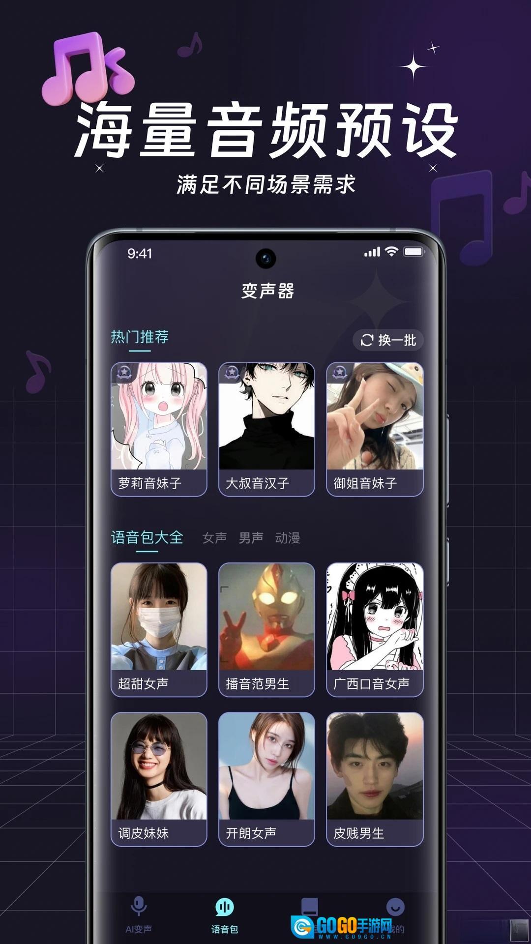 热门预设一键用:“吃鸡萌妹”“大叔卖萌”“动漫角色”等20+高频使用场景的音频预设,用户无需调试参数,点击即可使用,快速融入游戏或聊天氛围。
