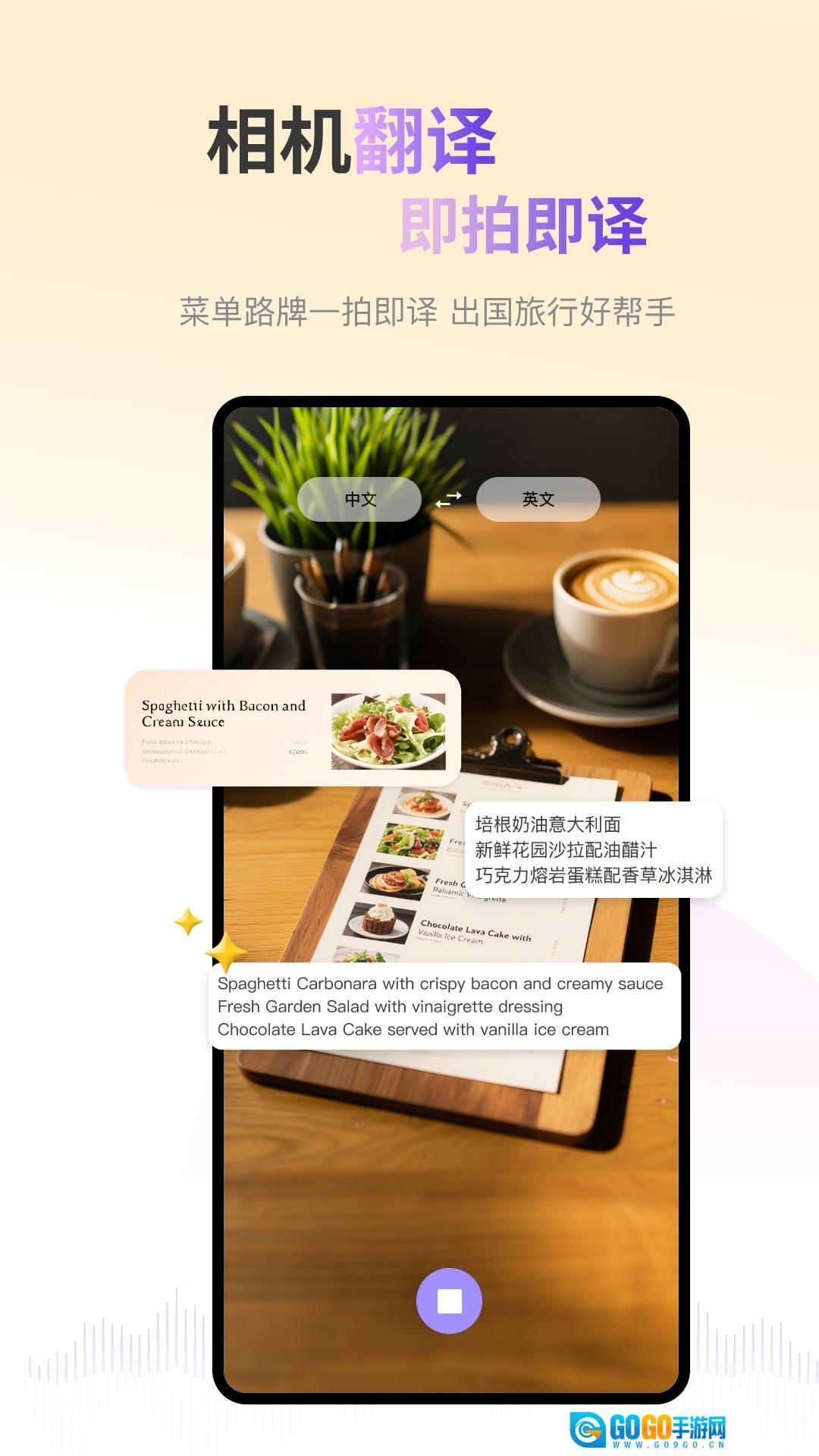 4、拍照翻译,点击“相机翻译”,对准菜单、路牌等文本;点击拍摄按钮,自动识别并翻译。