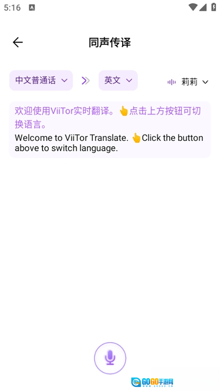 2、点击“同声传译”;选择源语言和目标语言;按住说话按钮,说完后松开,自动翻译并播报目标语言。