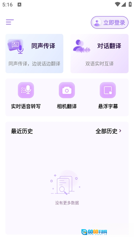1、安装并打开软件,在软件内有同声传译、对话翻译、实时语音转写、相机翻译、悬浮字幕等功能。