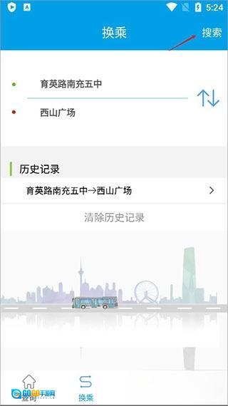 3、返回主界面,点击换乘,输入起点、终点即可查询相关线路走向,点击右上角的搜索即可;