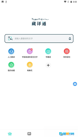 1、安装后进入首页,在搜索框内输入需要翻译的文字即可在线进行汉语和藏语的转换。