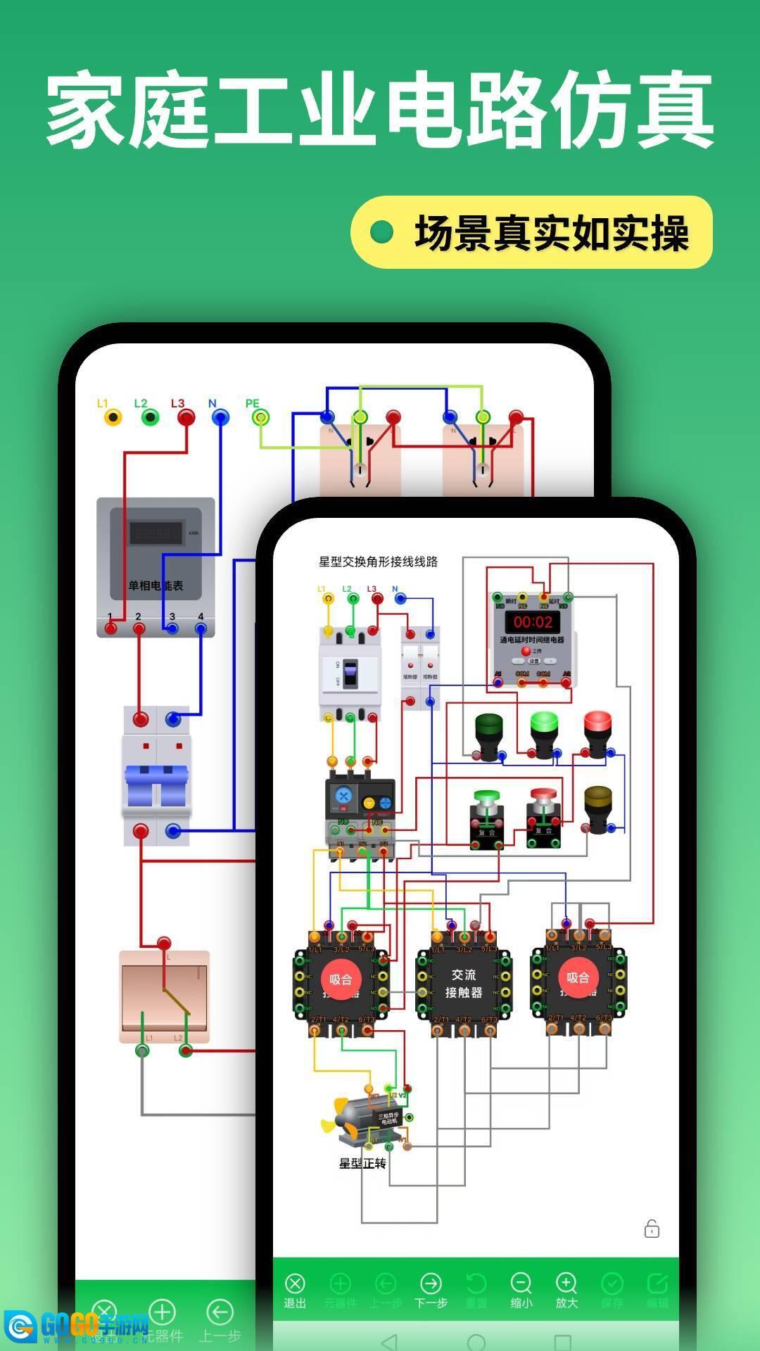 1.双场景仿真功能支持:该软件具备家庭电路与工业电路两种模式,家庭场景包含插座、开关、照明等日常电路配置,工业场景可实现三相电机控制、PLC逻辑等复杂系统模拟,能够满足从家庭维修到工业自动化的全领域应用需求。