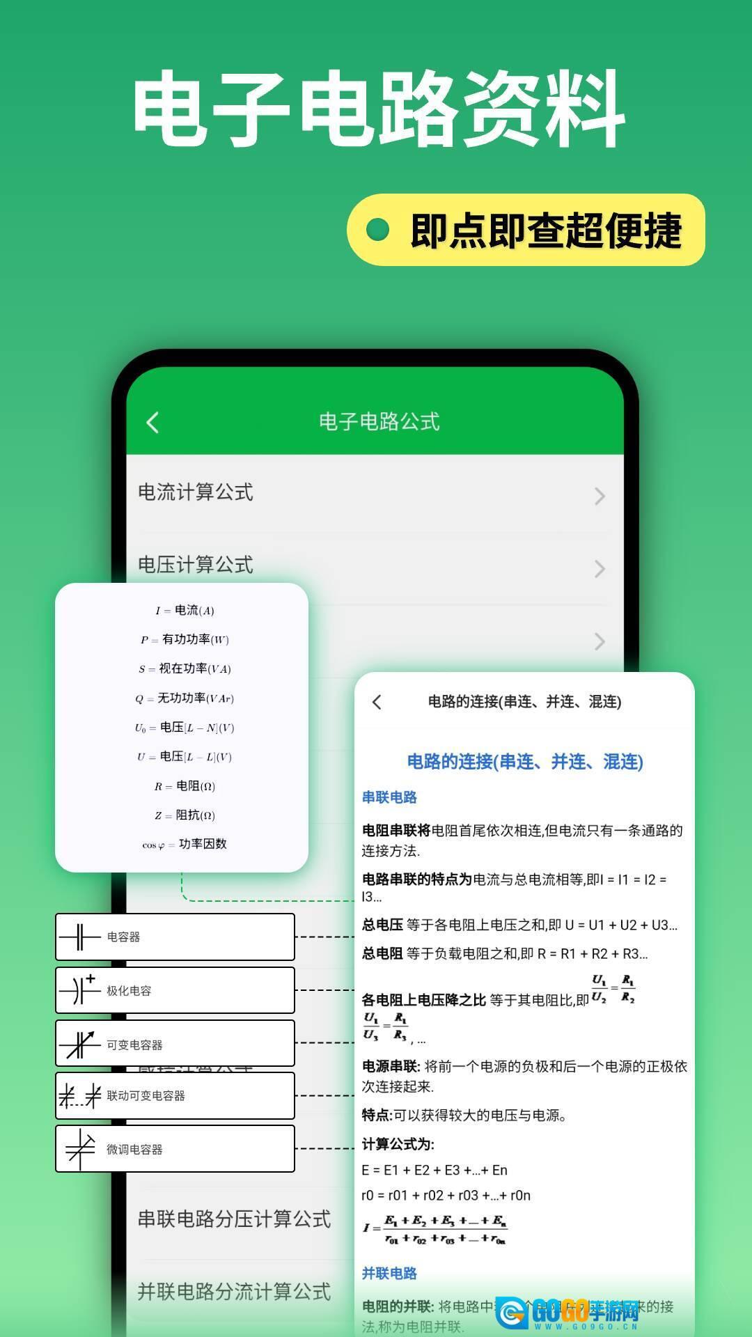 4.实用工具整合:包含色环电阻计算器(可识别4环与5环电阻)、电子公式库(收录欧姆定律、基尔霍夫定律等300余种公式)、符号查询系统(遵循IEC/GB标准),同时设有丰富的电路设计案例库,覆盖从基础到进阶阶段的200多个典型电路。