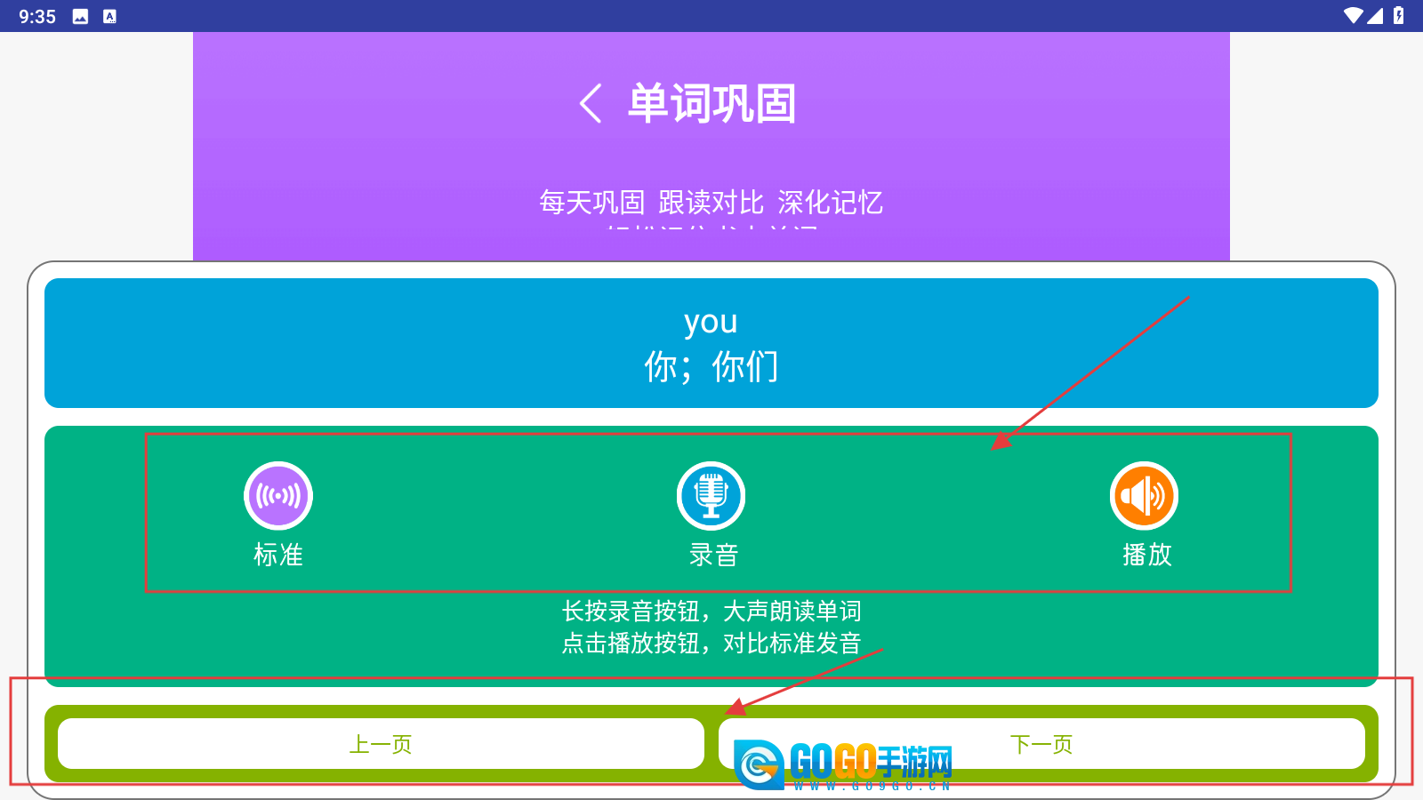 3、进入模块单词巩固,点击【标准】听发音,长按【录音】跟读,点【播放】对比,还能通过【上一页】【下一页】切换单词学习。