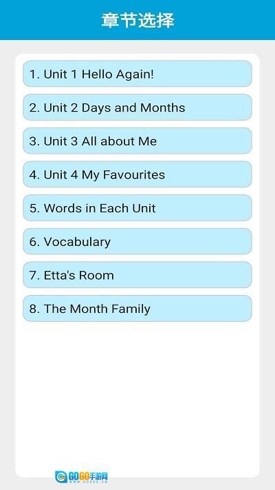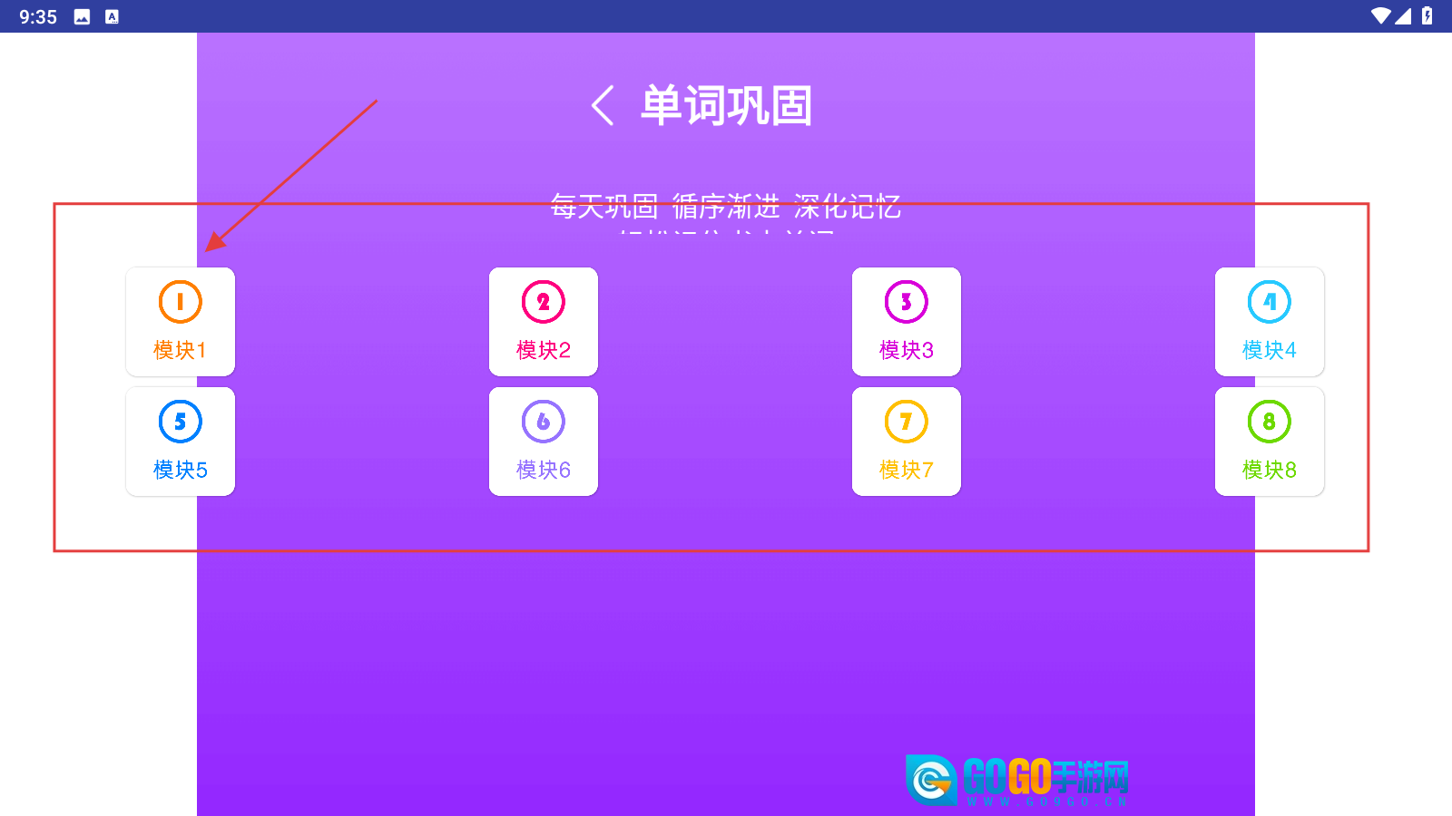2、进入“单词巩固”页面,选择对应模块(如模块1、模块2直至模块8)。