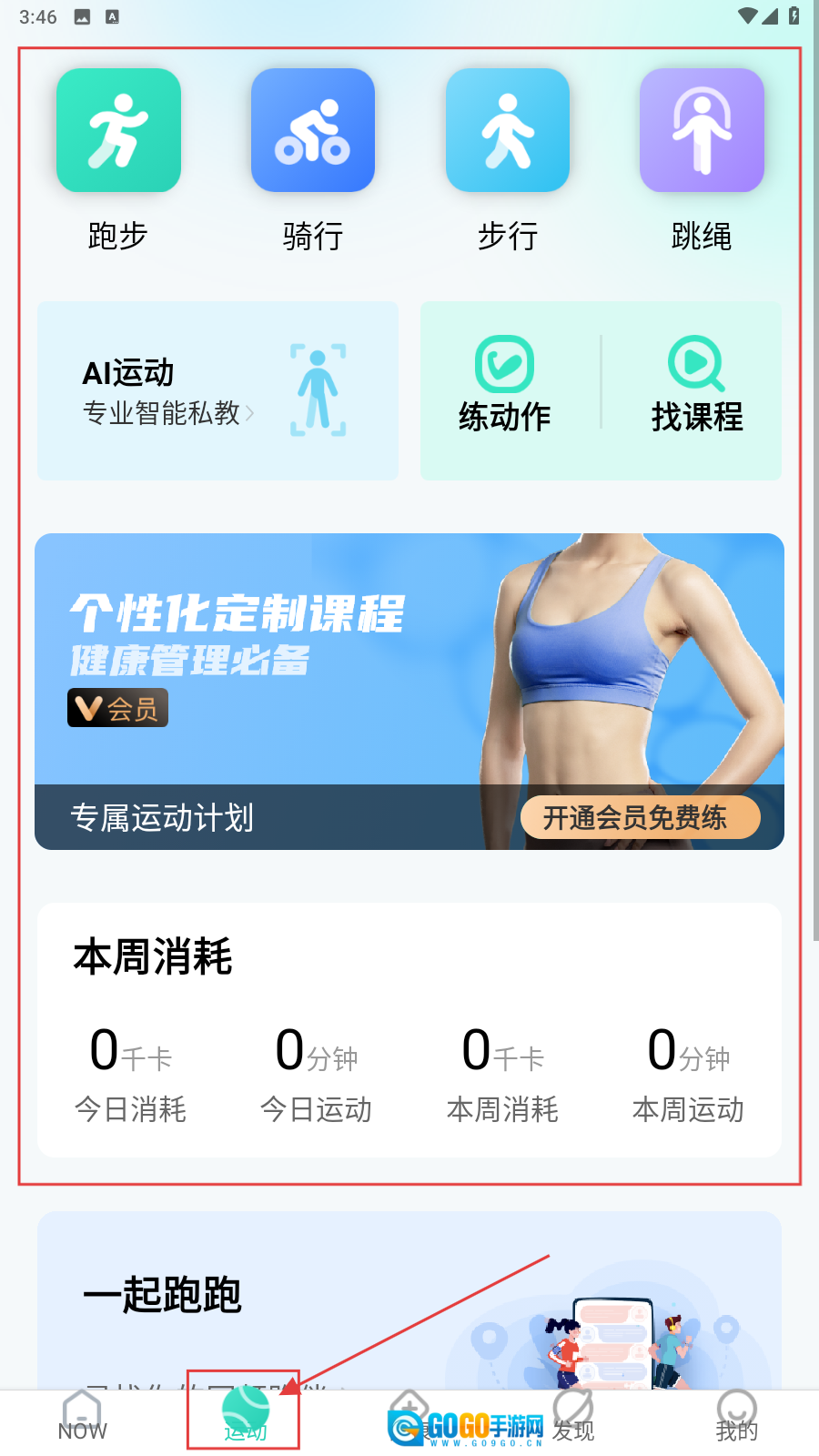 2、切换到【运动】界面,点击运动类型(跑步、骑行等)或课程(个性化定制课程),开启运动计划操作。