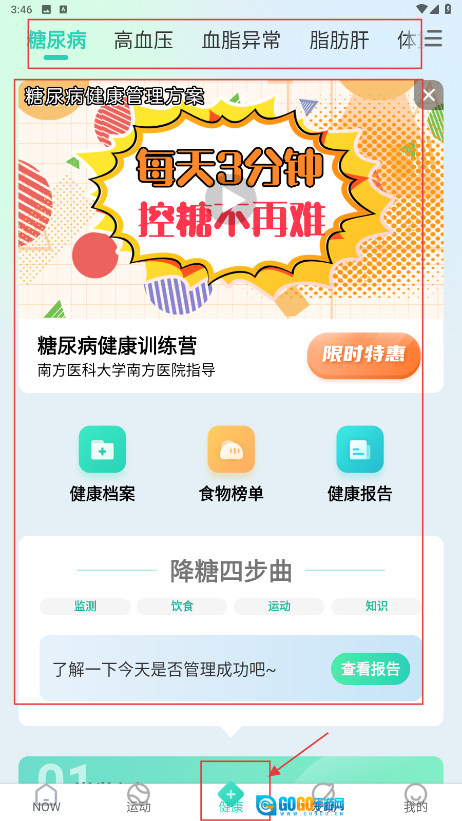 3、进入【健康】板块,选择疾病分类(糖尿病、高血压等),浏览健康管理方案,完成疾病健康管理内容查看任务。