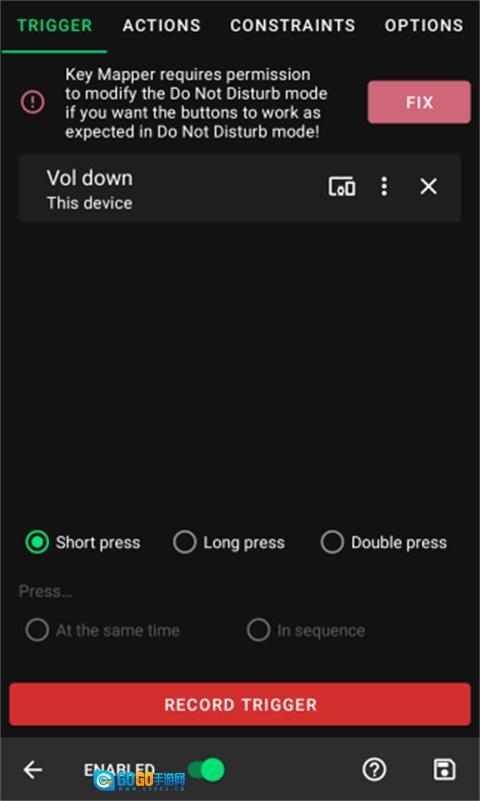 无论哪种情况,第一步都是记录一个触发器。点击红色的“记录触发”按钮,然后按下您想要更改其功能的物理按钮。在本指南中,我将用“降低音量”来演示。