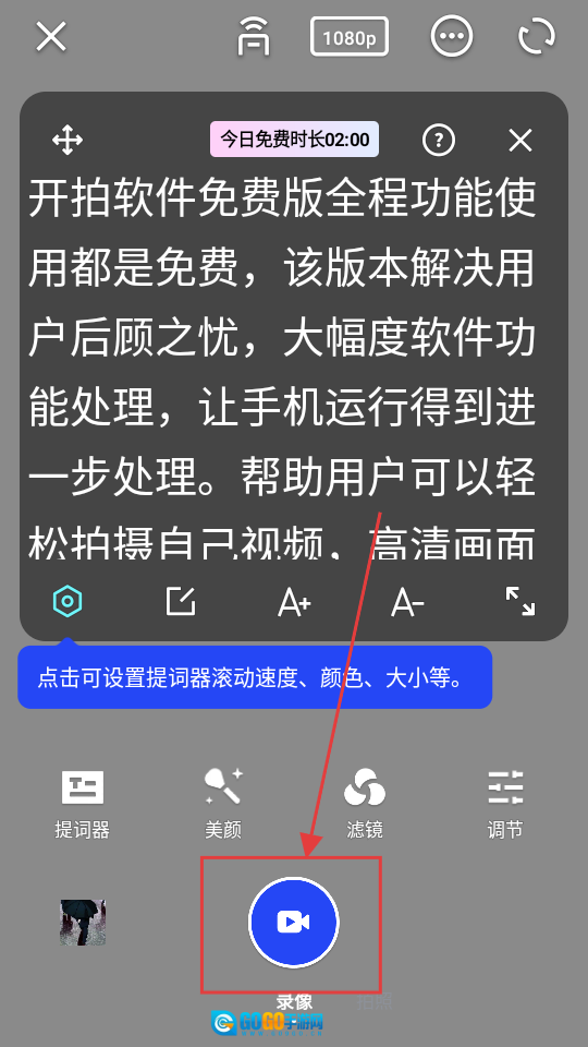 4、进入拍摄界面后,点击【录像】按钮,就能启动拍摄并启用提词器功能啦。