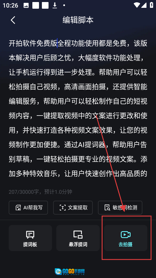 3、脚本编辑完成后,点击【去拍摄】按钮,即可进入拍摄页面使用提词器功能。