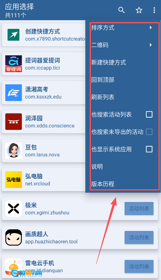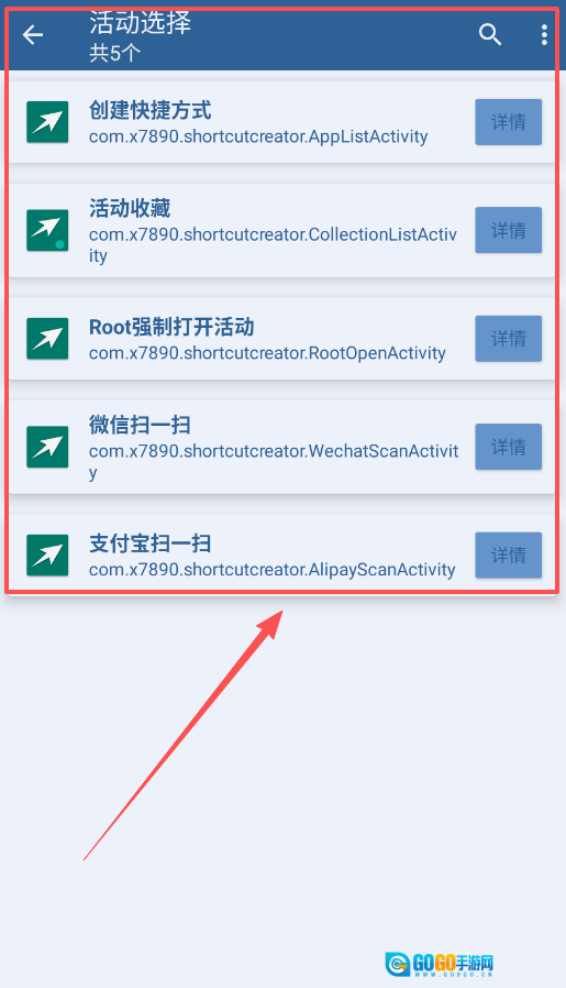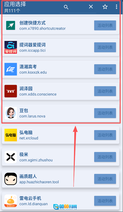 二、从活动列表里选择功能。每个应用下方会展示多个能直接进入的活动页面,像豆包的DouYinEntryActivity就属于这类。