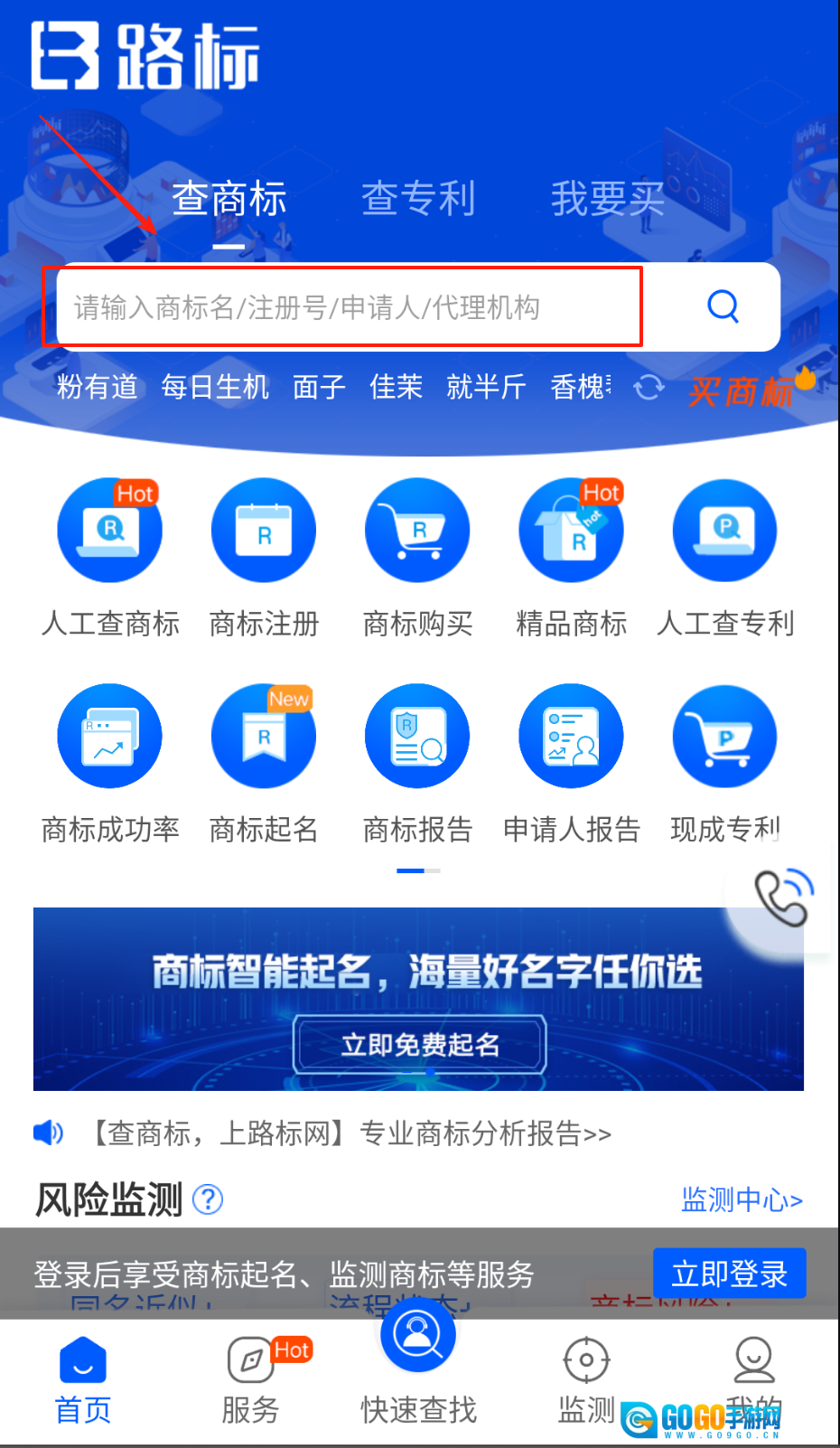 1、输入商标名称或注册号,点击搜索按钮即可获取相关基础信息。