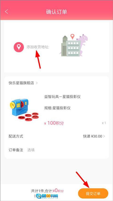 3、进入订单页面后,用户需添加收货地址,提交订单并支付相应积分即可完成操作。
