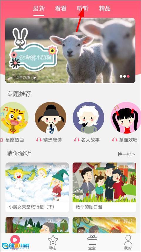 1、用户打开星猫乐园后,登录进入视听页面,页面上展示着儿歌、唐诗、成语、神话等各类专题推荐内容,用户可点击进行收听;