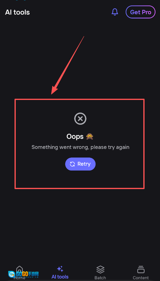 4、最后一张截图遇到AI工具加载失败,你可以尝试点击“重试”按钮。如果多次重试无效,检查一下软件是否有待更新的版本。