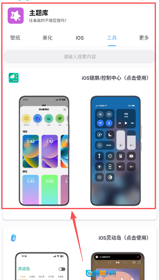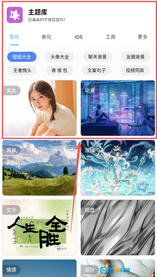 1、打开应用后,先在顶部的壁纸、美化、IOS、工具等标签中选择你需要的内容类型,从壁纸大全里找到喜欢的图片直接设为壁纸。