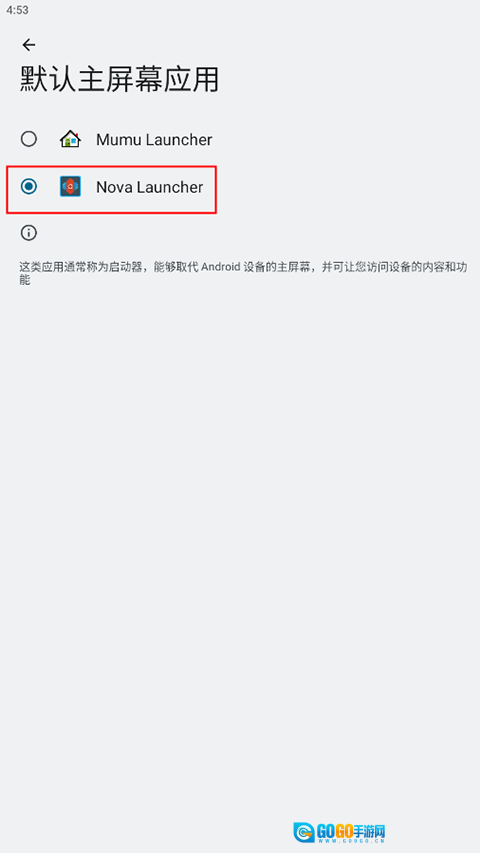 2、在“默认主屏幕应用”选项中选择“Nova Launcher”就可以了。