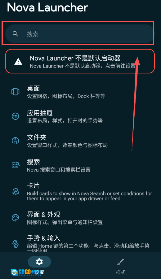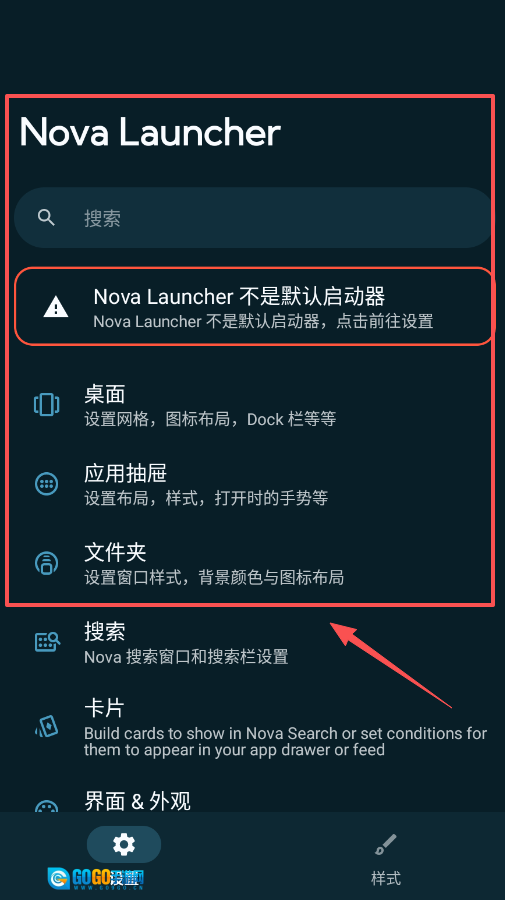1、首先处理默认启动器的问题,要是看到“Nova Launcher 不是默认启动器”的提示,直接点击该提示,系统会自动跳转至设置界面。
