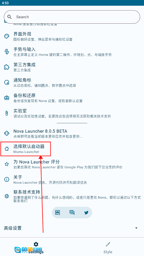1、打开,在设置页面下滑点击“选择默认启动器”;