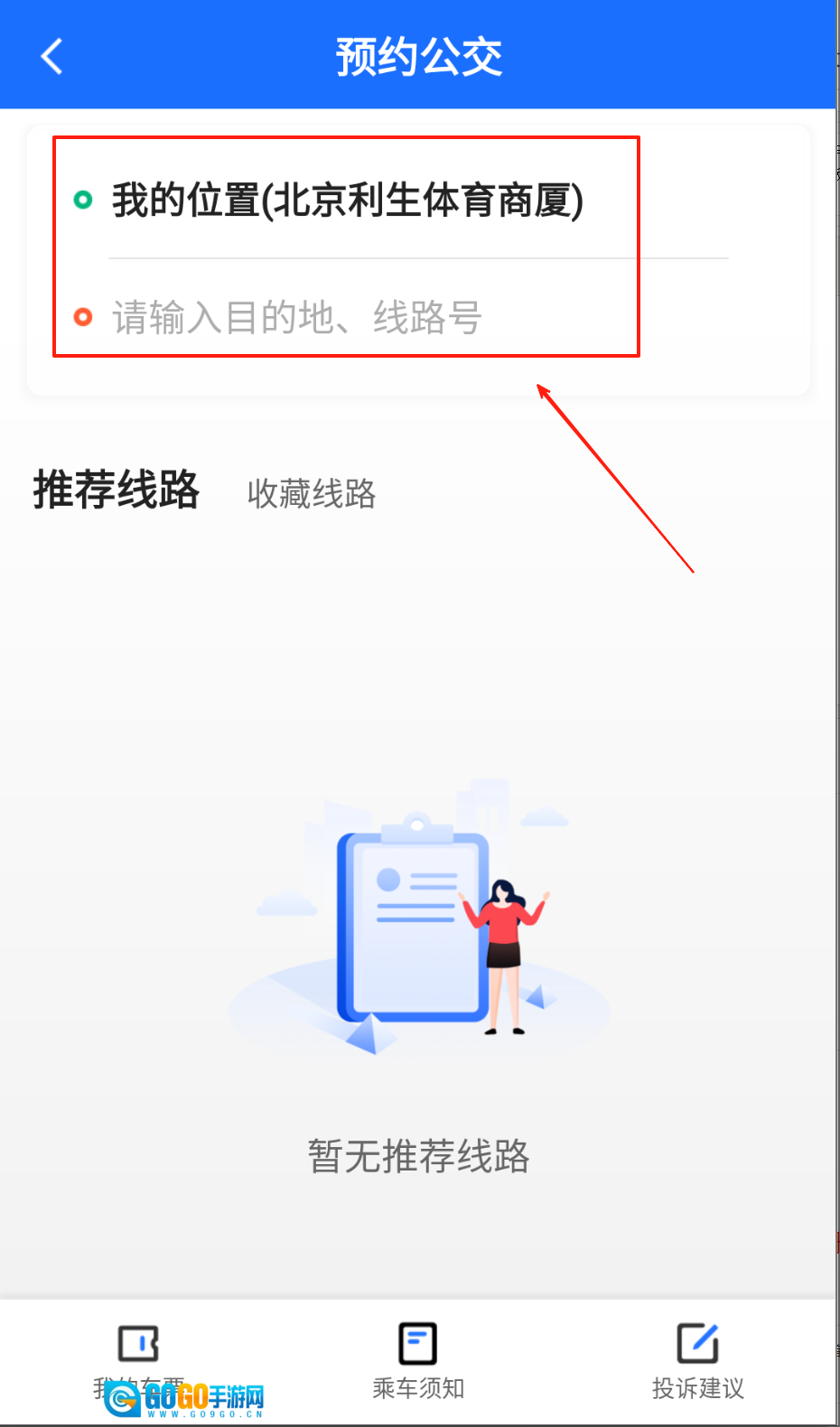 2、点击屏幕中间“请输入目的地、路线号”,输入想达到的目的地。