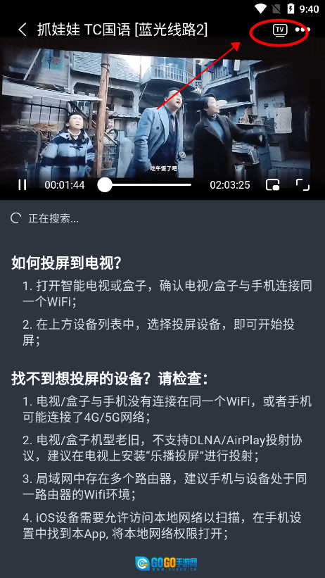 4、点击视频右上角的TV按钮就能投屏;投屏时请确认您的电视和手机处于同一wifi环境,不然无法完成投屏操作。